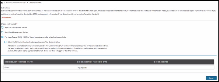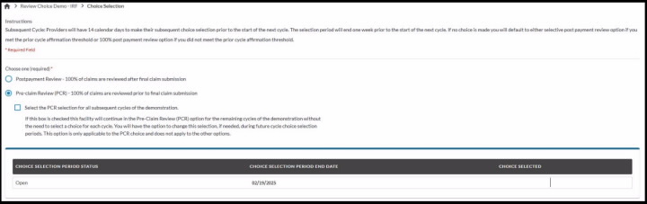 For Cycle 1, IRFs have a 30-day choice selection period that ends two weeks prior to the start of the demonstration in their state to make their review choice selection.