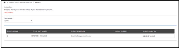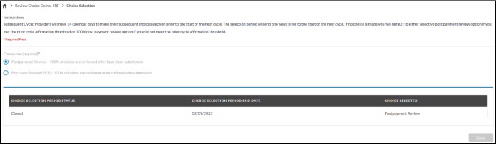 After the choice selection period ends, you will be able to view your Choice Selection, but the options will be locked and no longer available to edit. IRFs will not be able to change the review choice selection until the next review choice selection period for the next cycle. Users can review the choice selection option at any time to view the choice selection that was made.