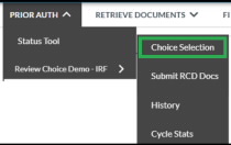 From the home page, select “Prior Auth” from the top menu and click on “Review Choice Demo – IRF” from the submenu to get a menu of choices related to the RCD.